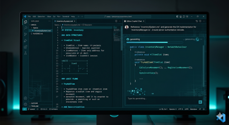 If you feed the above specification to an AI like Claude or GitHub Copilot, it cannot fail. You have eliminated the AI's ability to hallucinate. It knows exactly what data types to use, the exact names of your methods, the network architecture constraints (server-authoritative), and even the performance rules (no LINQ).